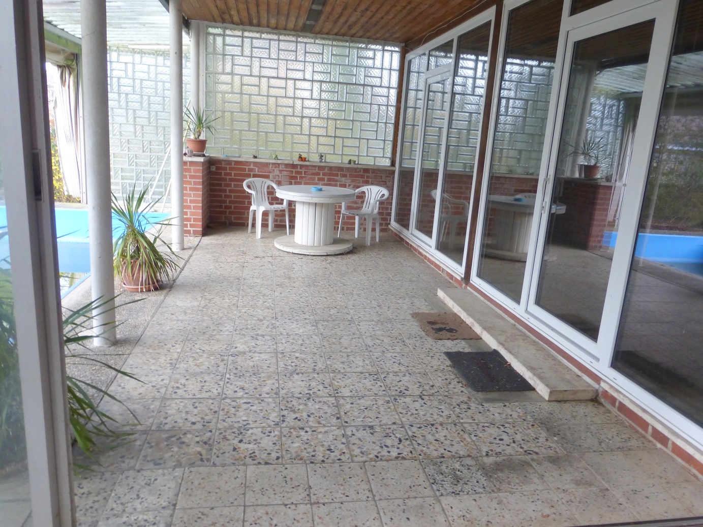 Die angenehm große, überdachte Terrasse lädt zum Verweilen ein. Ebenso der Pool am Haus.